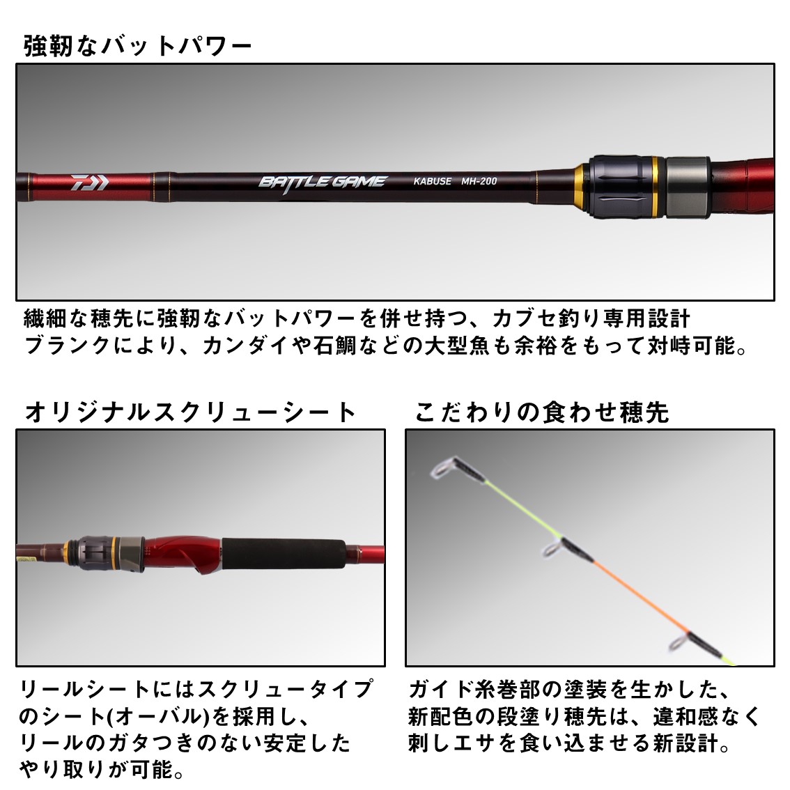 繊細なアタリを確実に目感度で伝えるグラスソリッド穂先を搭載し、ガイドの糸巻きにタフブライトを採用し、最強の目感度を演出。