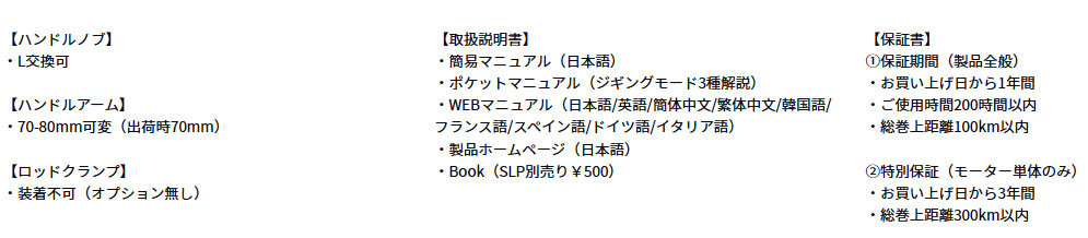 JOGパワーレバー・高耐久MAGMAX-Gモーターで電動ゲームの世界がより快適に。 手持ちで快適な軽量コンパクトボディー自重570g。 指掛かりの良い斜め形状のアルミ製JOGパワーレバーは、ワンハンド直感操作に更なる快適性をもたらせた。 またレスポンスの良い巻上力と高耐久のMAGMAX-Gモーター(3年保証)を搭載。高速落下/巻上速度・巻上力に磨きをかけ、電動ジギングにも対応。 手巻き性能において、HYPERDRIVE DIGIGEAR(ドライブギア+ピニオンギア)採用で高負荷でも滑らかな回転フィーリングを実現。 ハンドル手巻きは1回転87cm、ジギングでの誘いも専用リール同様のレスポンス。スタイリッシュな光輝シルバーデザインは、シーボーグの未来を奏でる証。 電動モバイルセッティングも対応し、電動ゲームの世界がより快適に。 |